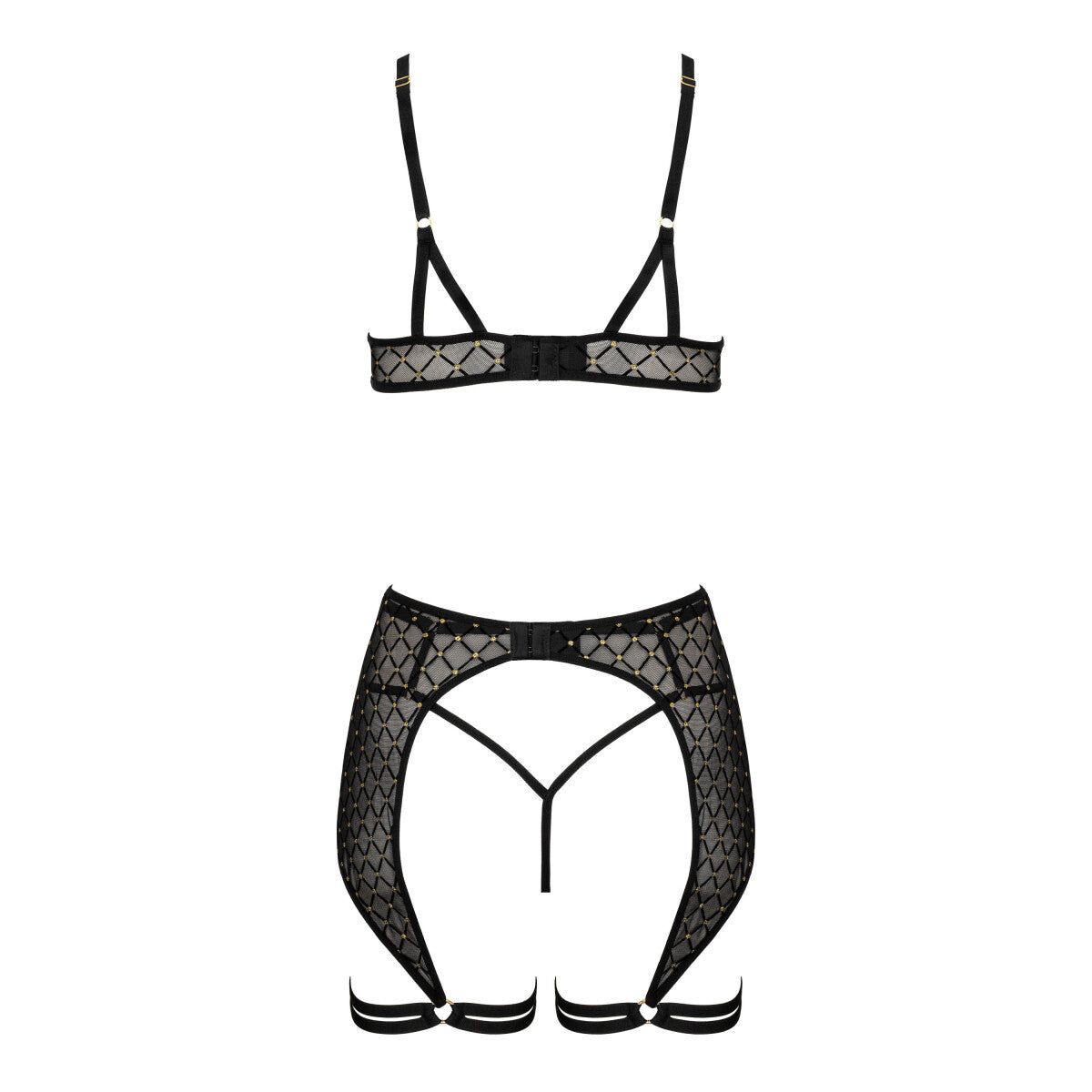 - fein gearbeitetes mesh met rautenmuster en goldfarbenen zierpunkten